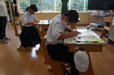 中学1年生の国語です。描く姿勢に気を付けながら、書写(硬筆)に取り組んでいました。一文字一文に集中して書いています。