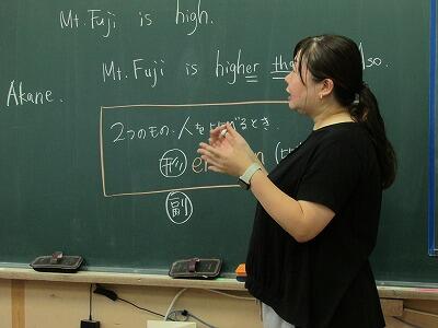 中2の英語の授業です。比較級を使って身近なものや人を比べる表現を練習しました。
