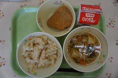 竹の子ごはん・魚そうめん汁・かぼちゃひき肉フライ・牛乳