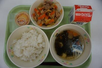 麦ごはん・牛乳・わかめスープ・豚キムチ炒め・焼きプリンタルト