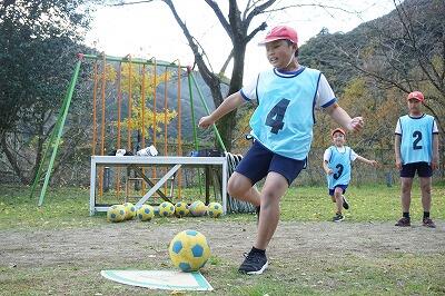 小学生の体育の様子です。持久走とサッカーの練習をしました。サッカーではチームの中で、攻めや守りなど役割を決めてプレイしました。ボールをうまくパスすることが難しい様子でしたが、子どもたちは自分の役割をこなしながら必死にボールを追いかけていました。