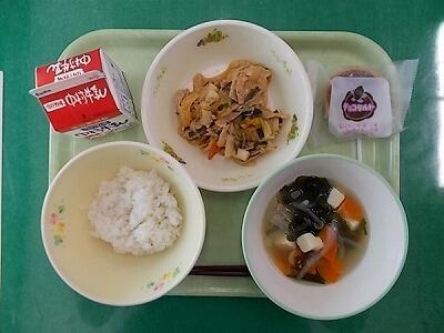 今日の献立は、麦ごはん、牛乳、豆乳汁、高菜そぼろ丼でした。色鮮やかな高菜そぼろ丼と温かい豆乳汁がとてもおいしかったです。