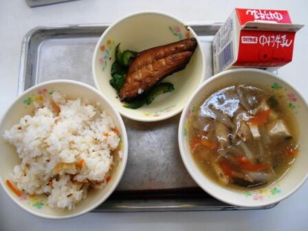 麦ごはん・ごもくみそ汁・さばのカレー風味焼き・ゆでもやし・牛乳
