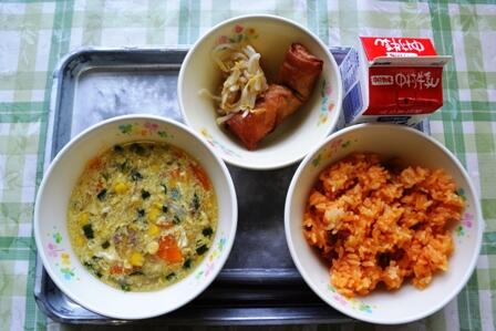 チキンピラフ・中華コーンスープ・中華春巻き・ゆでもやし・牛乳
