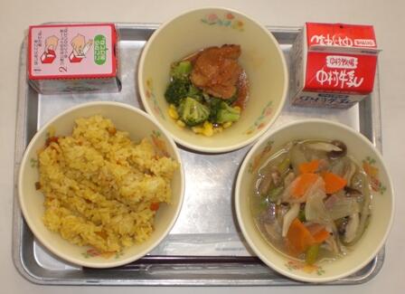 カレーピラフ、オニオンスープ、ゆで野菜、照り焼きチキン、クリスマスケーキ、牛乳