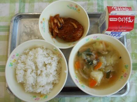麦ごはん・野菜スープ・ハンバーグのきのこソース・牛乳