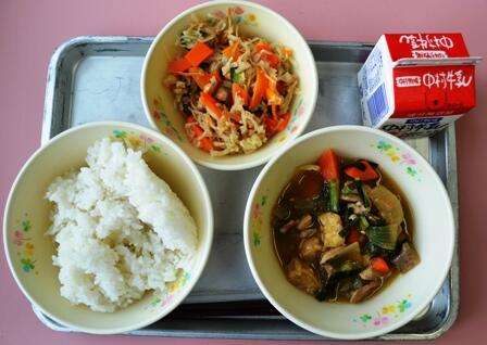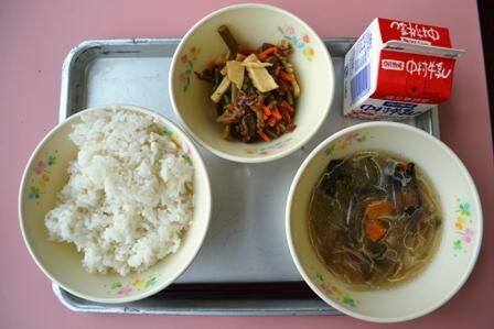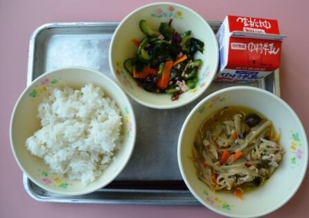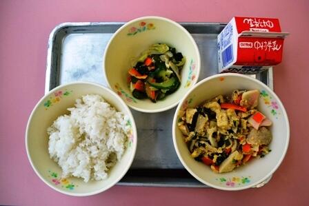 麦ごはん・のっぺい汁・れんこんきんぴら・しそ味ひじき・牛乳