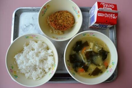 麦ごはん・なめこ汁・ダイズと豆腐のフライ・ゆでもやし・牛乳