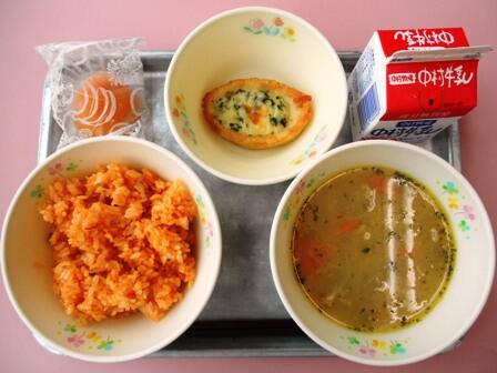 チキンピラフ・コーンスープ・かぼちゃカップグラタン・フローズン桃・牛乳