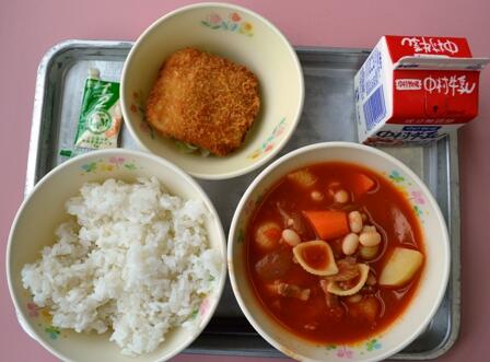 麦ごはん・ミネストローネ・白身魚のフライ・ゆでキャベツ・タルタルソース・牛乳
