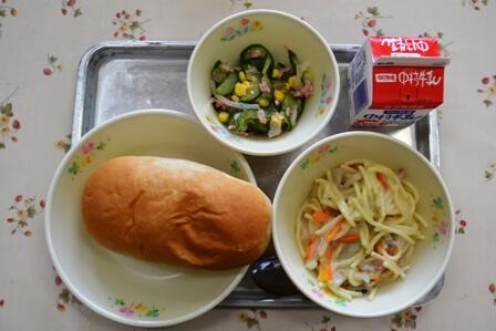 減量コッペパン・きのこのクリームスパゲティ・ハムのマリネ・牛乳