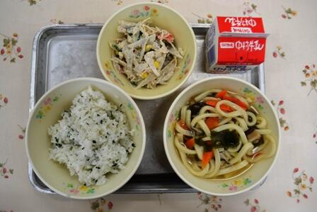 減量菜飯・わかめうどん・ごぼうサラダ・牛乳