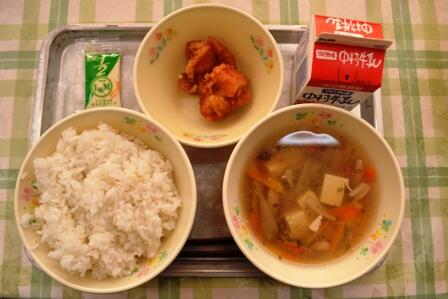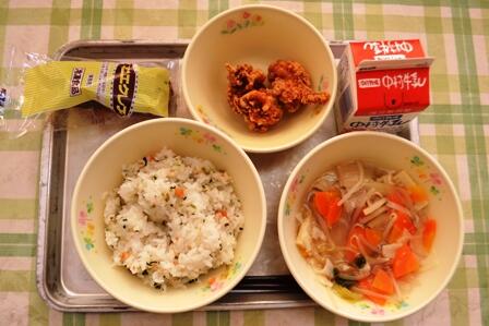 さけなめし・ワンタンスープ・鶏肉の唐揚げ・エクレア・牛乳