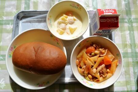 黒糖パン・ペンネのトマト煮・フルーツヨーグルト・牛乳