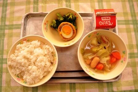 麦ごはん・ポトフ・スコッチエッグ・ボイルブロッコリー・牛乳