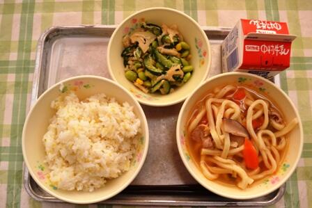 減量あわごはん・キムチうどん・しゃきしゃきサラダ・牛乳