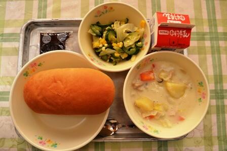 コッペパン・冬野菜のクリーム煮・グリーンサラダ・セレクトジャム・牛乳