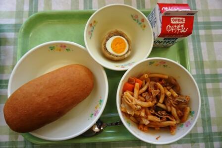 減量コッペパン・野菜とマカロニのトマト煮・スコッチエッグ・牛乳
