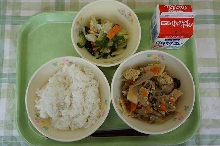 麦ごはん・ごぼうの柳川煮・ごまずあえ・牛乳