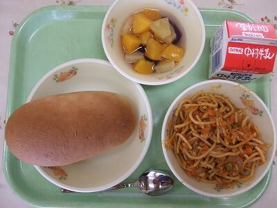 黒糖パン・スパゲティミートソース・ぶどうゼリーあえ・牛乳