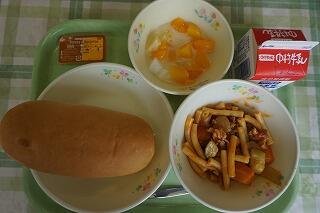 コッペパン・牛乳・豚肉と野菜のトマト煮・ミルク寒天和え・はちみつマーガリン