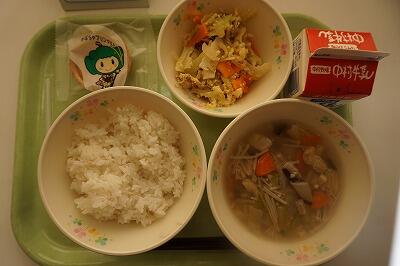 麦ごはん・牛乳・さんぺい汁・野菜チャンプルー・かぼちゃプリンタルト