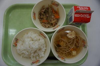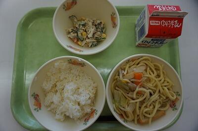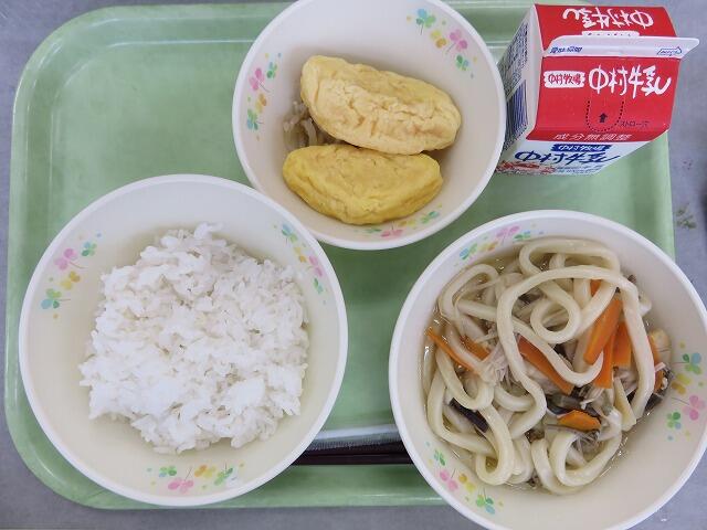 今日の給食は、麦ごはん、牛乳、魚そうめん、豚丼でした。魚そうめんと麩のもちもちした食感がとてもおいしかったです。