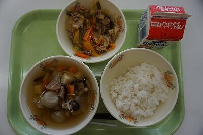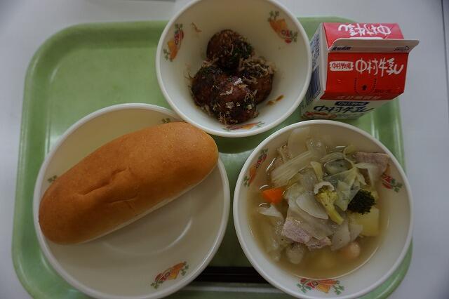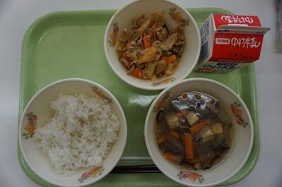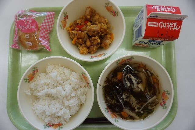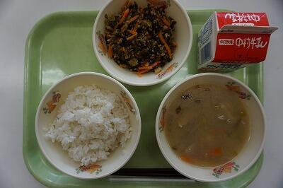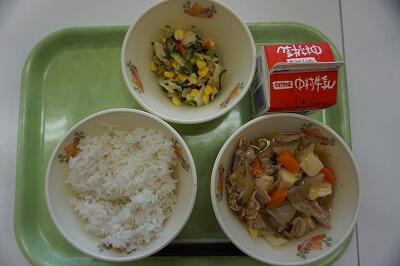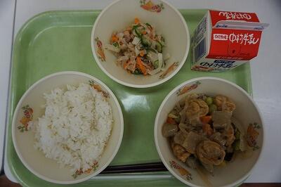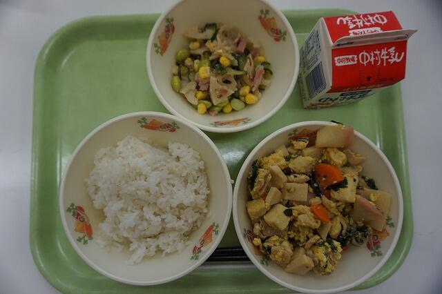 今日の給食は、麦ごはん、かきたま汁、ドライカレー、牛乳でした。