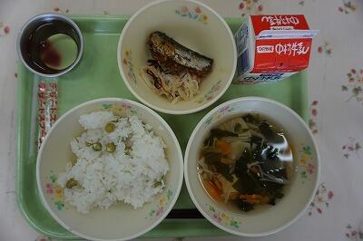えんどうまめ・すまし汁・いわしかんろ煮・塩こんぶあえ・ゼリー・牛乳