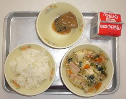 麦ごはん、かきたま汁、さばごま味噌煮、牛乳