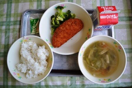 麦ごはん・オニオンスープ・さけフライ・ゆでブロッコリー・ノンエッグタルタルソース・牛乳