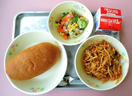 減量コッペパン・なすのミートスパゲティ・フレンチサラダ・牛乳
