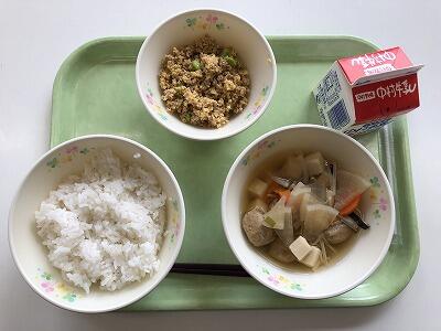 麦ごはん、牛乳、あじのつみれ汁、三色丼