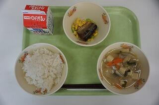 麦ごはん、牛乳、根菜のみそ汁、さんまの甘露煮、ごまあえ