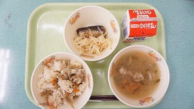 減量鶏ごぼうごはん、牛乳、みぞれ汁、いわし梅煮、ゆでもやし