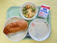 今日の給食は、米粉パン、クリームシチュー、ミモザサラダ、牛乳 でした。米粉パンにクリームシチュー、ベストマッチな組み合わせでとてもおいしかったです。ミモザサラダもさわやかな味でおいしかったです。