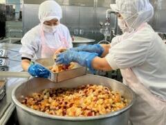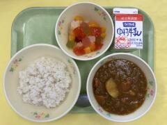 今日の給食は、麦ご飯、ビーフカレー、フルーツカクテル、牛乳 でした。今日のカレーは、ビーフももちろんですが、大ぶりにカットされたジャガイモがホクホクでとてもおいしかったです。デザートの冷たくて甘いフルーツカクテルも最高でした。