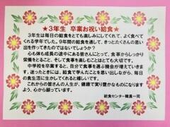 今日の給食は、卒業生のお祝い献立。メニューは、麦ご飯、野菜ゴロゴロあったかスープ、鶏肉の唐揚げ、茹でキャベツ、お祝いケーキでした。いつも献立を考えてくださっている黒木先生と調理員の方々から、卒業生のみんなに向けてお祝いの気持ちのたくさんこもった給食、とてもおいしくいただきました。3年生も感慨深げに食べていました。