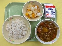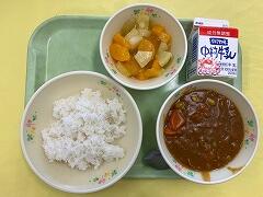 今日の給食は、麦ご飯、ポークカレー、大根サラダ、牛乳 でした。程よい辛さのポークカレーをご飯と一緒においしくいただきました。合い間で食べるサラダも大根がシャキシャキで、とてもおいしかったです。