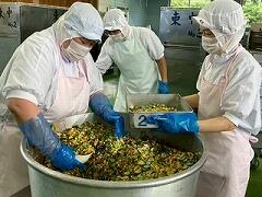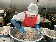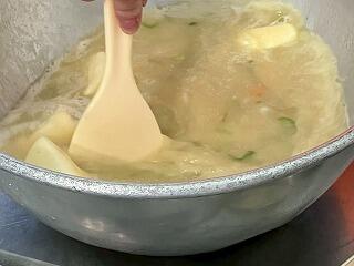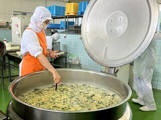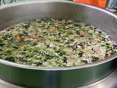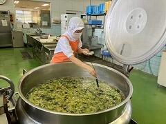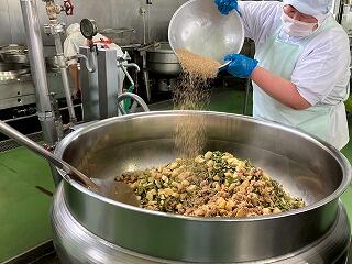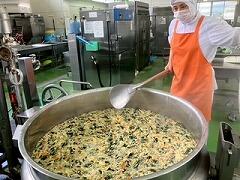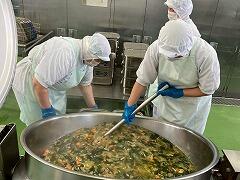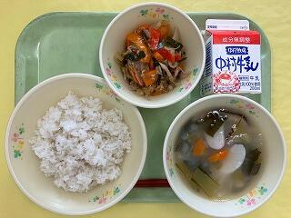 今日の給食は、麦ご飯、いももち汁、高菜そぼろ丼(具)、牛乳 でした。高菜そぼろの味が絶品で、温かいご飯にかけて一緒に食べたらとてもおいしかったです。いももち汁もおいしくて、お腹いっぱいになりました。