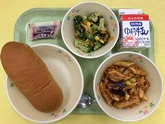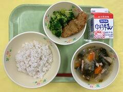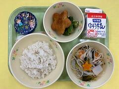 今日の給食は、麦ご飯、ごまみそ煮、カルシウムたっぷりサラダ、牛乳 でした。ごまみそ煮は、ごまとみその風味と味がご飯とマッチしていてとってもおいしかったです。あと、サラダに入っていたチーズが星の形をしていてかわいかったです。