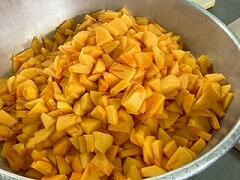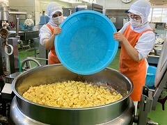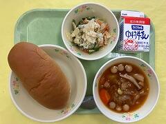 今日の給食は、米粉パン、さつまいものクリームシチュー、フルーツカクテル、牛乳 でした。シチューの中のさつまいもがほくほくで噛むごとに自然の甘さが口の中に広がって、とてもおいしかったです。また合い間に食べる冷たいフルーツカクテルが最高でした。