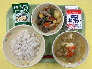 今日の給食は、麦ご飯、団子汁、厚揚げとれんこんのそぼろ煮、牛乳 でした。団子汁に入っていた団子は、宮崎県産のお米が使われているとのことで、もちもちしていてとてもおいしかったです。