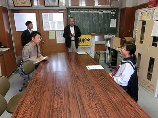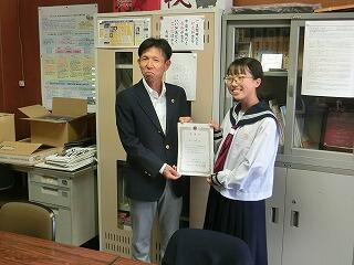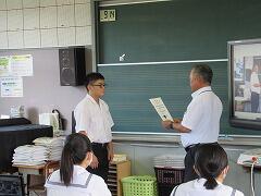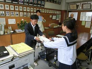 本校生徒が国税庁主催の「税に関する作文」に応募し、優秀作品に選ばれたということで、今日、税理士の方が表彰に来てくださいました。中学生の段階で税に興味をもち、このような作文を書けるということがとても素晴らしいことだと思います。税理士の方も、「将来はぜひ税理士に!」と言われていました。