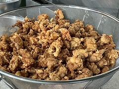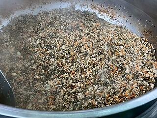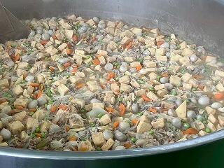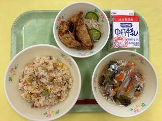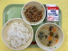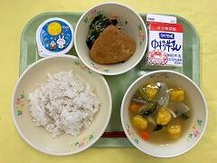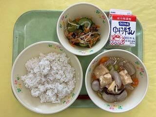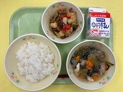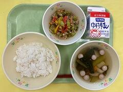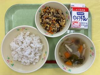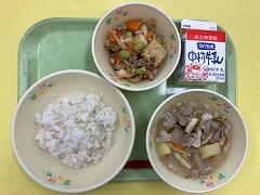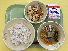 今日の給食は、麦ご飯、厚揚げのそぼろ煮、茎わかめの酢の物、牛乳 でした。厚揚げのそぼろ煮は、サトイモ、干しシイタケ、タケノコ、厚揚げと具だくさんで、味わいも最高においしかったです。酢の物も、茎わかめの食感がとてもよくて、おいしくいただきました。