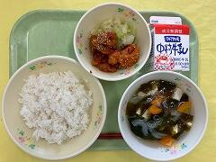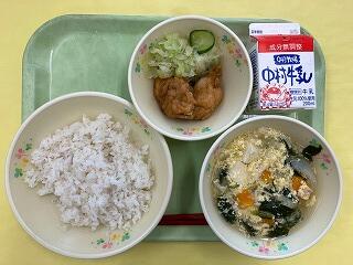 今日の給食は、「ひむか地産地消の日」献立でした。メニューは、麦ご飯、かきたま汁、チキン南蛮、添え野菜、牛乳 でした。みんなに大人気のチキン南蛮とふわふわ卵のかきたま汁、とてもおいしくてあっという間に完食してしまいました。
