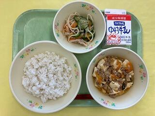 今日の給食は、麦ご飯、麻婆豆腐、冷やし中華サラダ、牛乳 でした。普段より少しピリッと辛味の効いた麻婆豆腐をご飯にかけて「麻婆丼」にして食べたところ、とてもおいしかったです。