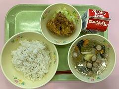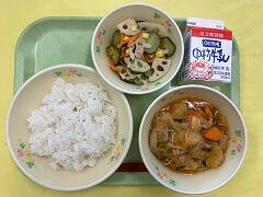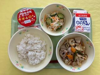 今日の給食は、麦ご飯、筑前煮、和風大根サラダ、ヨーグルト、牛乳 でした。野菜たっぷりの筑前煮に和風サラダ、おまけにヨーグルトまでついて、本当に健康的でおいしい給食でした。いつもありがとうございます。