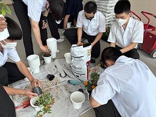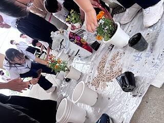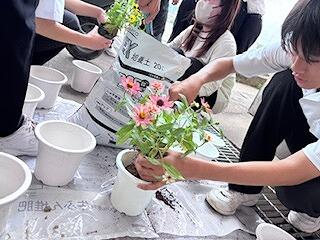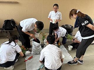 花の植え替えに向けて、各クラスの環境委員会の生徒たちが、花壇やプランターの土を耕し、肥料をすき込んでくれました。昼休みの作業で生徒たちには申し訳なかったのですが、みんな積極的に作業をしてくれました。来週に花を植える予定です。
