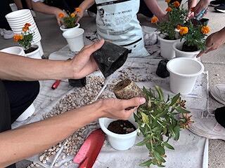 先日いただいた人権の花、花壇に植えた余りの苗を、教室用の鉢植えにしました。各学級の環境委員会のみんなが、一つ一つ大切に植え替えてくれました。花の種類は、マリーゴールドと百日草(ジニア)です。これから水やりや花柄つみなどのお世話をして、大切に育てていきます。学校に来られた際には、ぜひご覧ください。